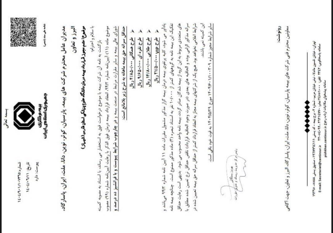 3- مبلغ حق بیمه به ازا هر نفر جهت سطح همگانی: 460000 تومان (چهارصد و شصت هزار تومان)، سطح نقره ای: 807000 تومان (هشتصد و هفت هزار تومان) و سطح طلایی: 1200000 تومان (یک میلیون و دویست هزار تومان) و سطح (VIP): 1800000 تومان (یک میلیون و هشتصد هزار تومان) می باشد.